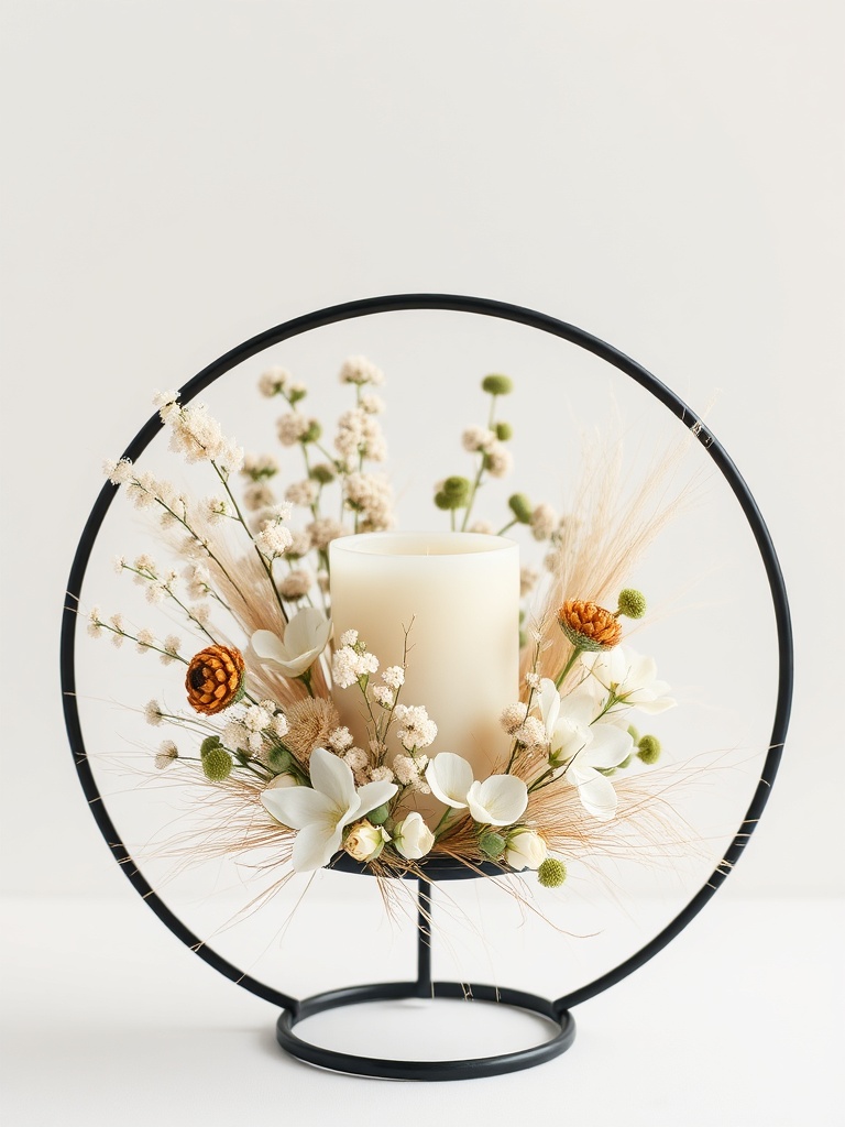 Dieser elegante Kerzenhalter auf schwarzem Metallring ist mit weißen Trockenblumen, Eukalyptus und zarten Gräsern geschmückt. Die Kombination aus Grün und Weiß schafft eine frische, natürliche Atmosphäre. Passend für Stabkerzen — ein wunderschönes Deko-Element für jeden Raum.